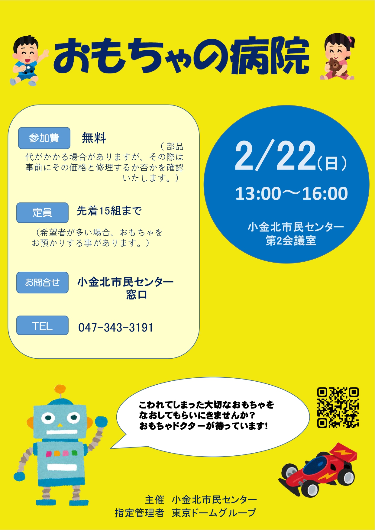 場所小金北市民センター 第2会議室持ち物なし 参加費なし ※電池などの部品代が掛かる場合があります定員先着15名様まで(希望者が多い場合、おもちゃをお預かりすることがあります)その他お申し込みはお電話またはセンター受付までお願いします。