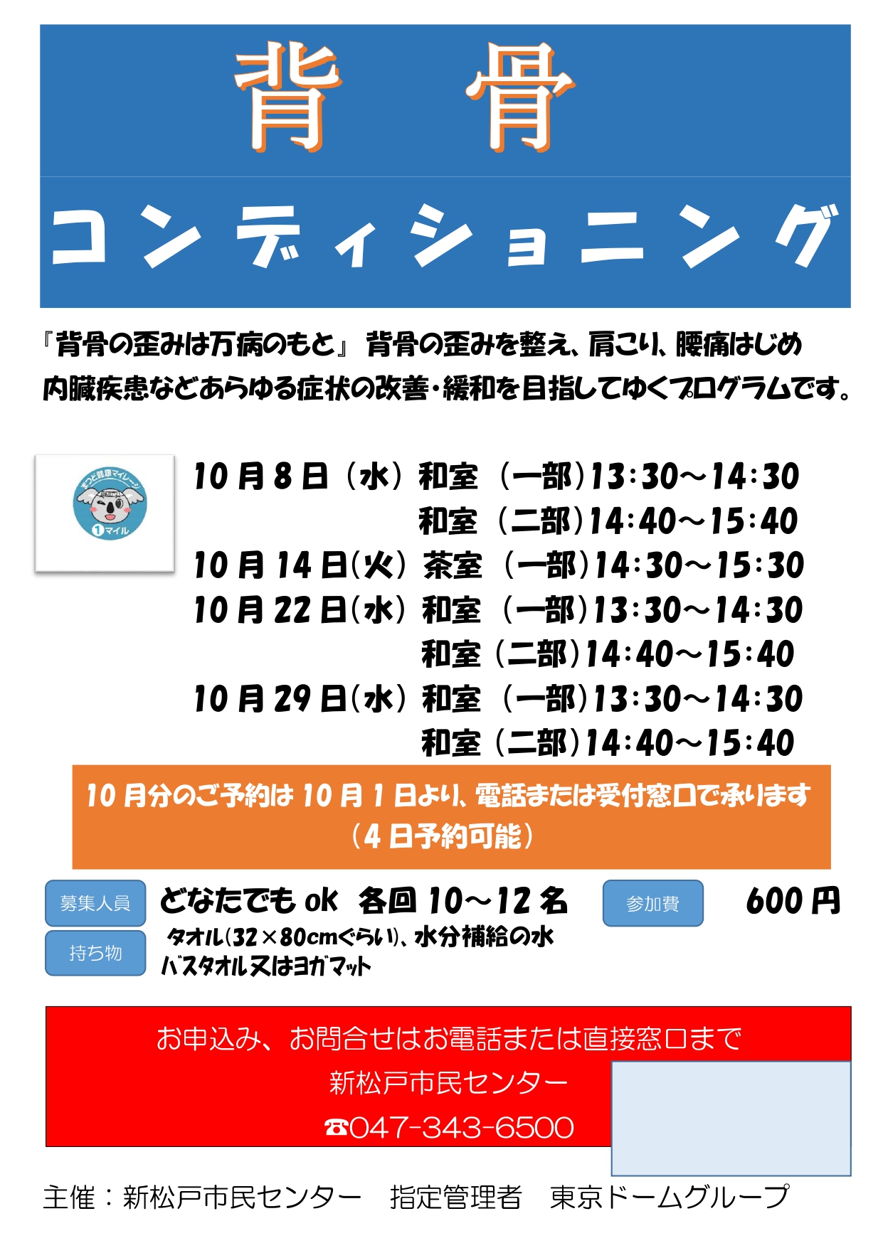 場所新松戸市民センター 茶室持ち物タオル(32×80cmくらい)、水分補給の水、バスタオル又は(あれば)ヨガマット参加費600円定員10~12名その他予約受付は2025年10月1日より開始します。お一人様4回まで予約可能です。お電話またはセンター受付までお願いします。