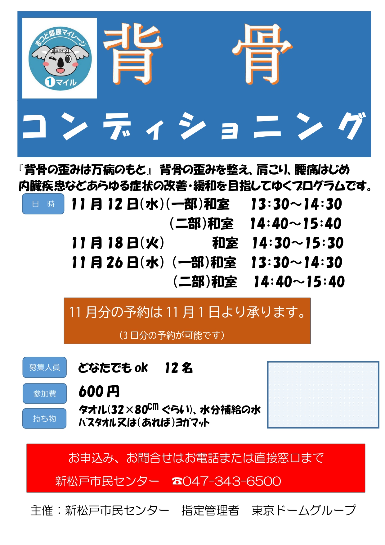 場所新松戸市民センター 和室持ち物タオル(32×80cmくらい)、水分補給の水、バスタオル又は(あれば)ヨガマット参加費600円定員12名その他予約受付は2025年11月1日より開始します。お一人様3回まで予約可能です。お電話またはセンター受付までお願いします。
