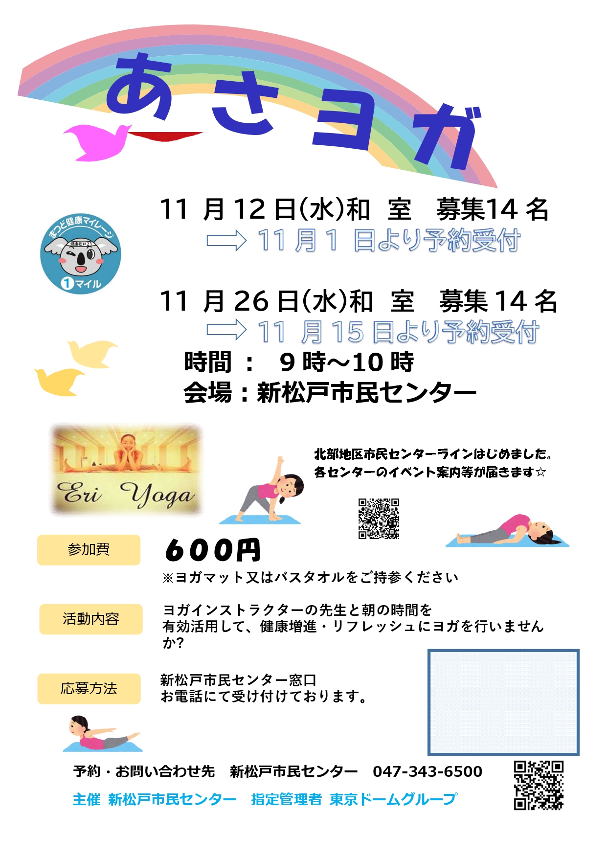 ヨガインストラクターの先生と朝の時間を有効活用して、健康増進・リフレッシュにヨガを行いませんか?