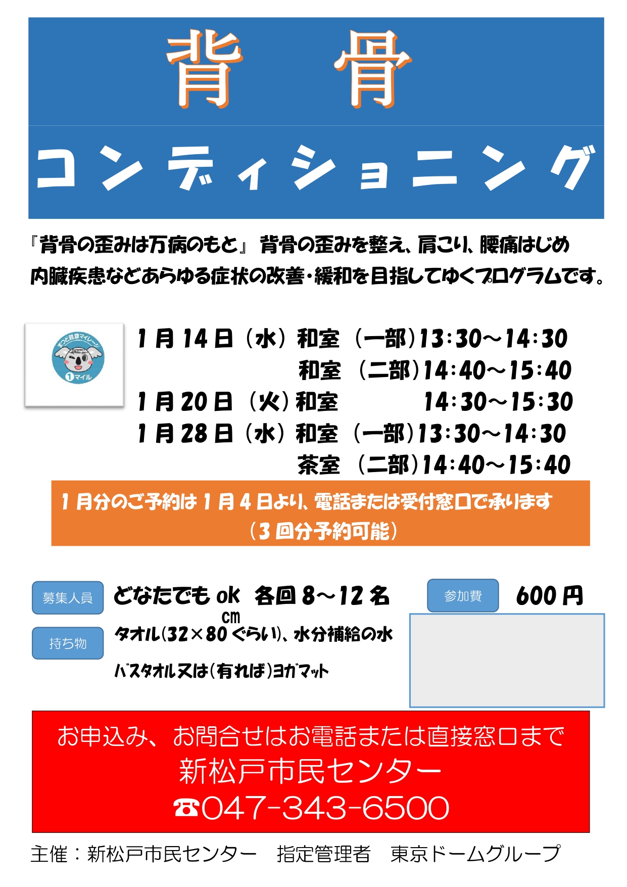 場所新松戸市民センター 茶室持ち物タオル(32×80cmくらい)、水分補給の水、バスタオル又は(あれば)ヨガマット参加費600円定員8名その他予約受付は2026年1月4日より開始します。お一人様3回まで予約可能です。お電話またはセンター受付までお願いします。