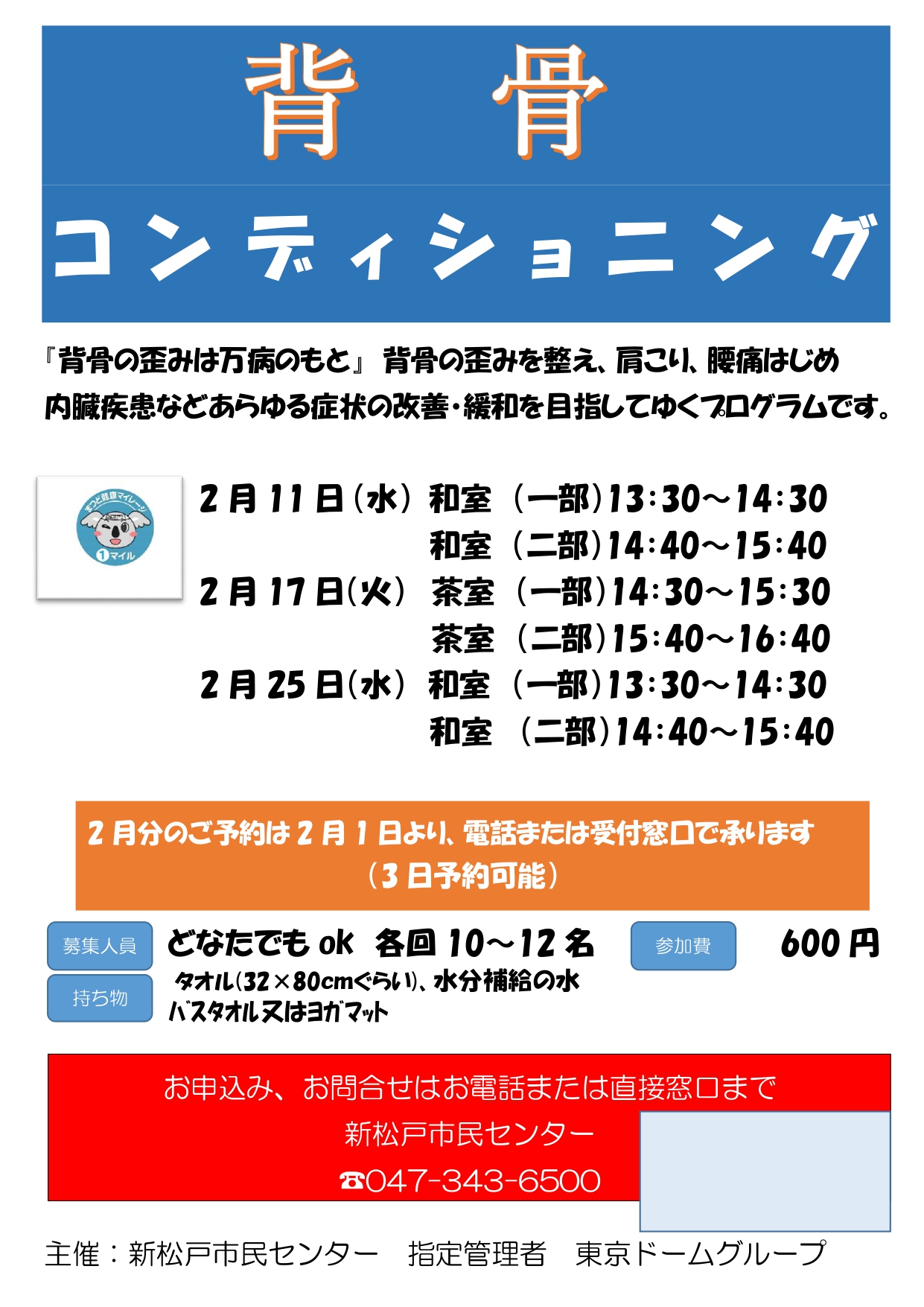 場所新松戸市民センター 茶室持ち物タオル(32×80cmくらい)、水分補給の水、バスタオル又は(あれば)ヨガマット参加費600円定員10名その他予約受付は2026年2月1日より開始します。お一人様3回まで予約可能です。お電話またはセンター受付までお願いします。