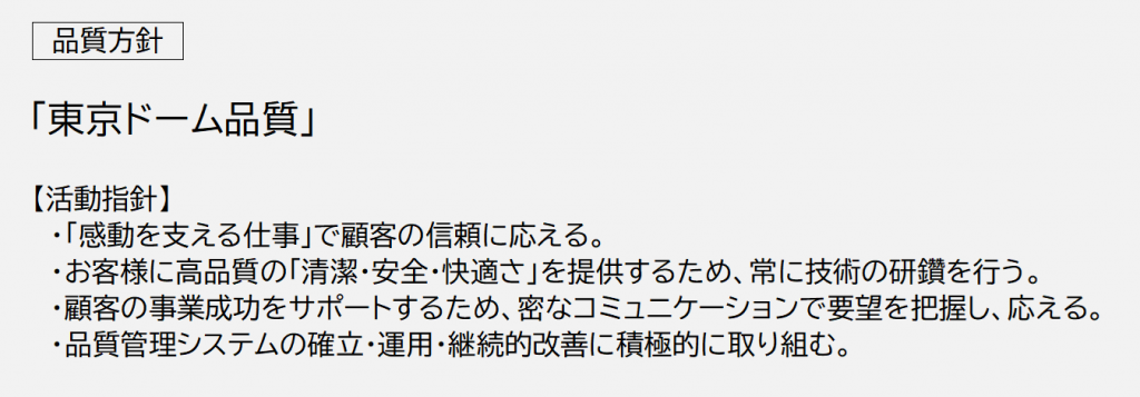 東京ドームという唯一無二の施設で管理を行う私たちは、「清潔・安全・快適さ」の品質にこだわってきました。ISO(※)の手法を用い、PDCAサイクルを回して常にその品質向上に努めています。さらにはそのノウハウをいろいろな施設に広げ、お客様に気持ちよく利用していただける環境づくりに努めています。